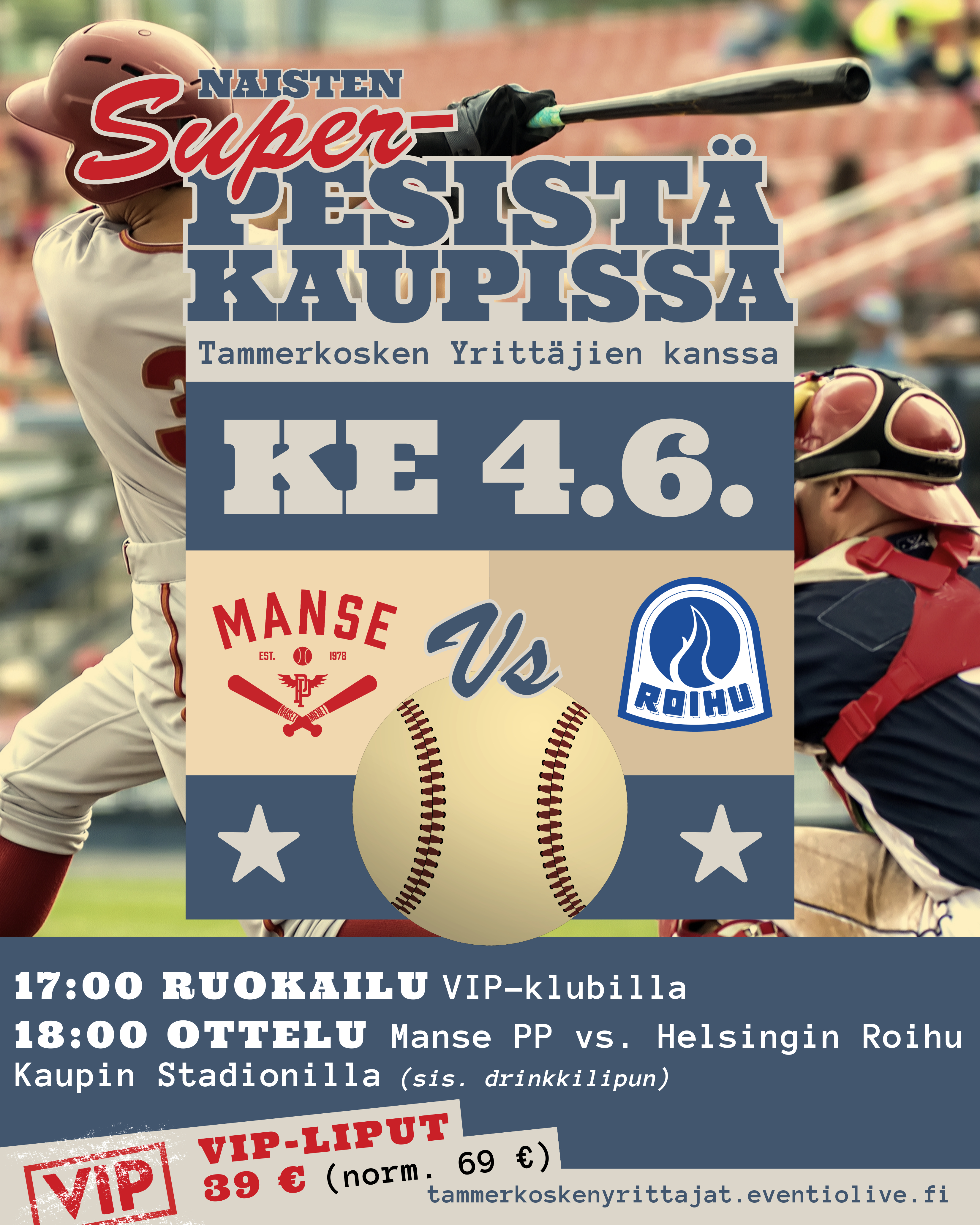 Kutsu on avec, eli jokainen jäsenyritys voi ostaa max. 2 lippua jäsenetuhintaan. Lippuja on tarjolla rajoitetusti, joten kannattaa toimia nopeasti! Liput ovat saatavilla Eventiossa: tammerkoskenyrittajat.eventiolive.fi. Tule mukaan kokemaan pesäpallon huumaa ja nauttimaan kesäillasta upeaan Kauppiin!
