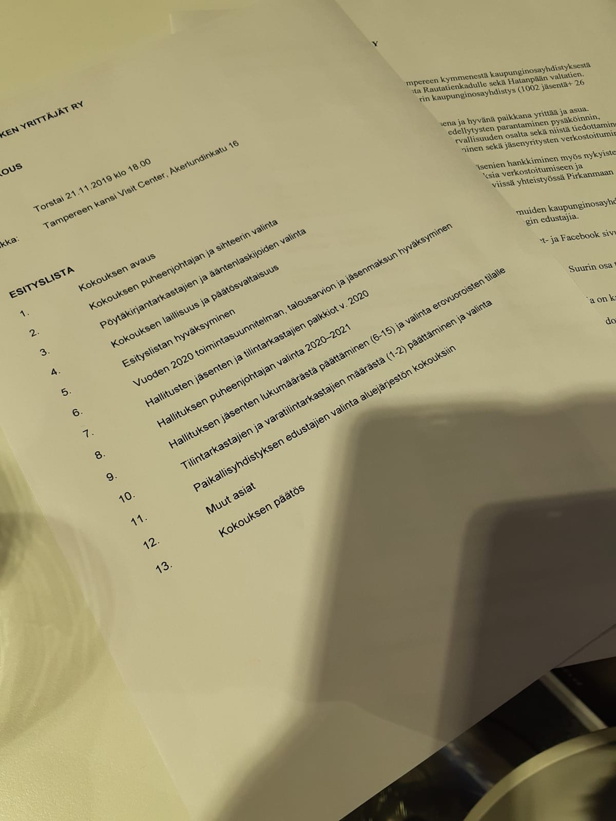 Yhdistyksen sääntömääräinen syyskokous järjestettiin torstaina 21. marraskuuta klo 18:00 Tampere Kansi Visit Centerillä. Kokouksessa käytiin läpi mm. vuoden 2020 toimintasuunnitelmaa ja talousarviota, keskusteltiin hallituksen kokoonpanosta sekä valittiin muita vastuuhenkilöitä mm. aluejärjestöjen kokouksia silmällä pitäen.