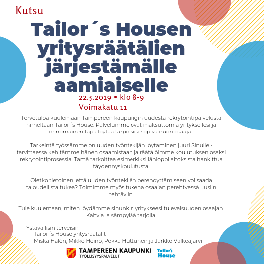 Koti Tapahtumat Tailor’s Housen aamiaistilaisuus 22.5. klo 8-9 TapahtumatUutiset Tailor’s Housen aamiaistilaisuus 22.5. klo 8-9 Tekijä Eetu Ruusukallio - 2.5.2019 702 0 Tailor`s House järjestää Tammerkosken Yrittäjille aamiaistilaisuuden uudesta rekrytointipalvelusta keskiviikkona 22.5. klo 8-9. Osoite: Voimakatu 11. Tervetuloa mukaan – ilmoittautumiset info@tammerkoskenyrittajat.fi! LIITTYVÄT ARTIKKELITLISÄÄ TEKIJÄLTÄ Tappara–Ilves paikallisottelu 21.4.2026 Tärskyt Teatterilla 9.4. klo. 17:15 🎭 Tammerkosken Taaperrus 26.3. klo. 17:30 👟 Tammerkosken Yrittäjät 40v -video Tammerkosken Yrittäjät 40v -video 28.2.2024 Tammerkosken Yrittäjät 30v -video Tammerkosken Yrittäjät 30v -video 9.11.2023 Vuoden Yrittäjä 2024 -video Tammerkosken Vuoden Yrittäjä 2024: Keskus Galleria, Pauliina ja Pekka Kivisalo 2.11.2024