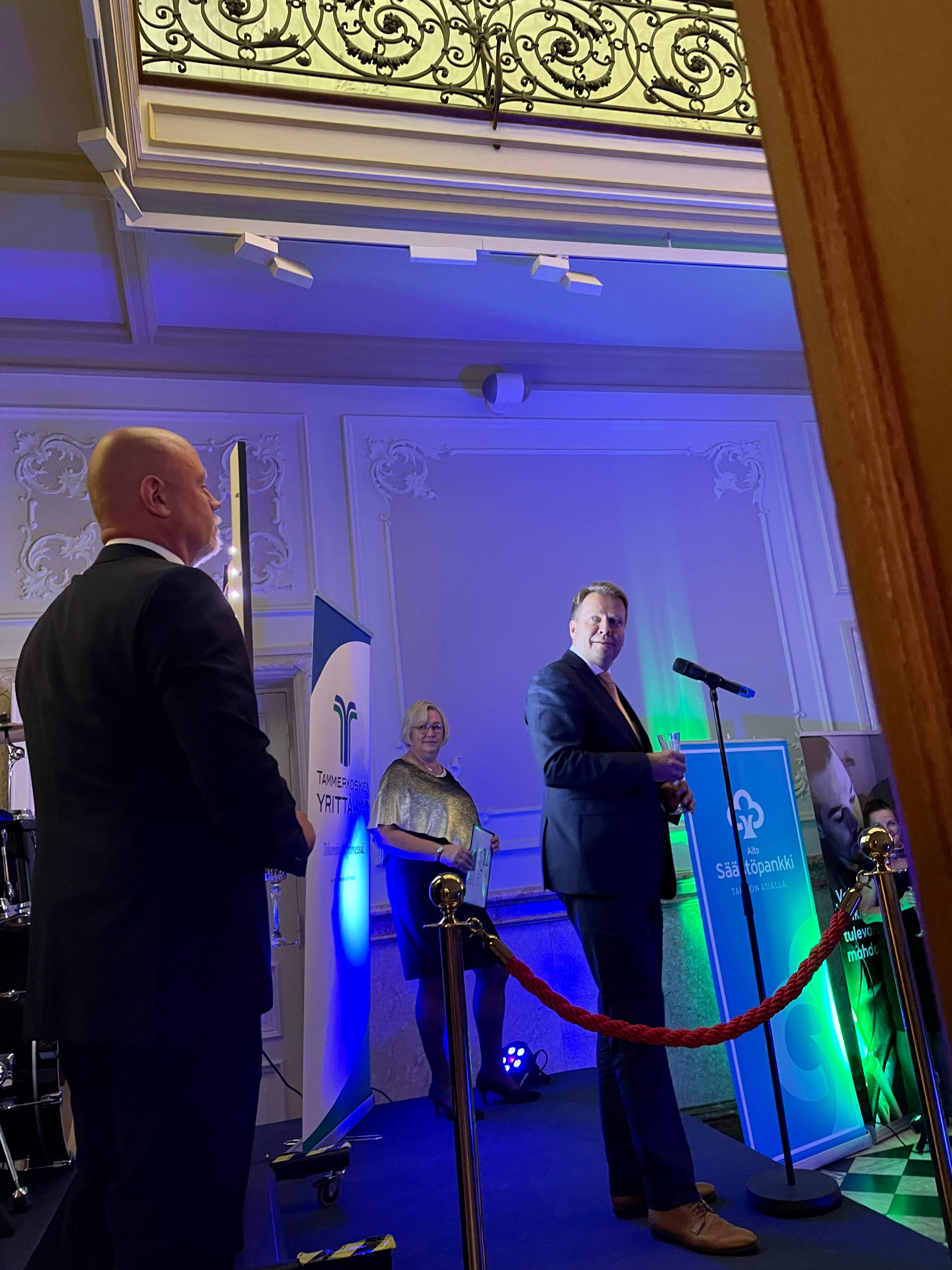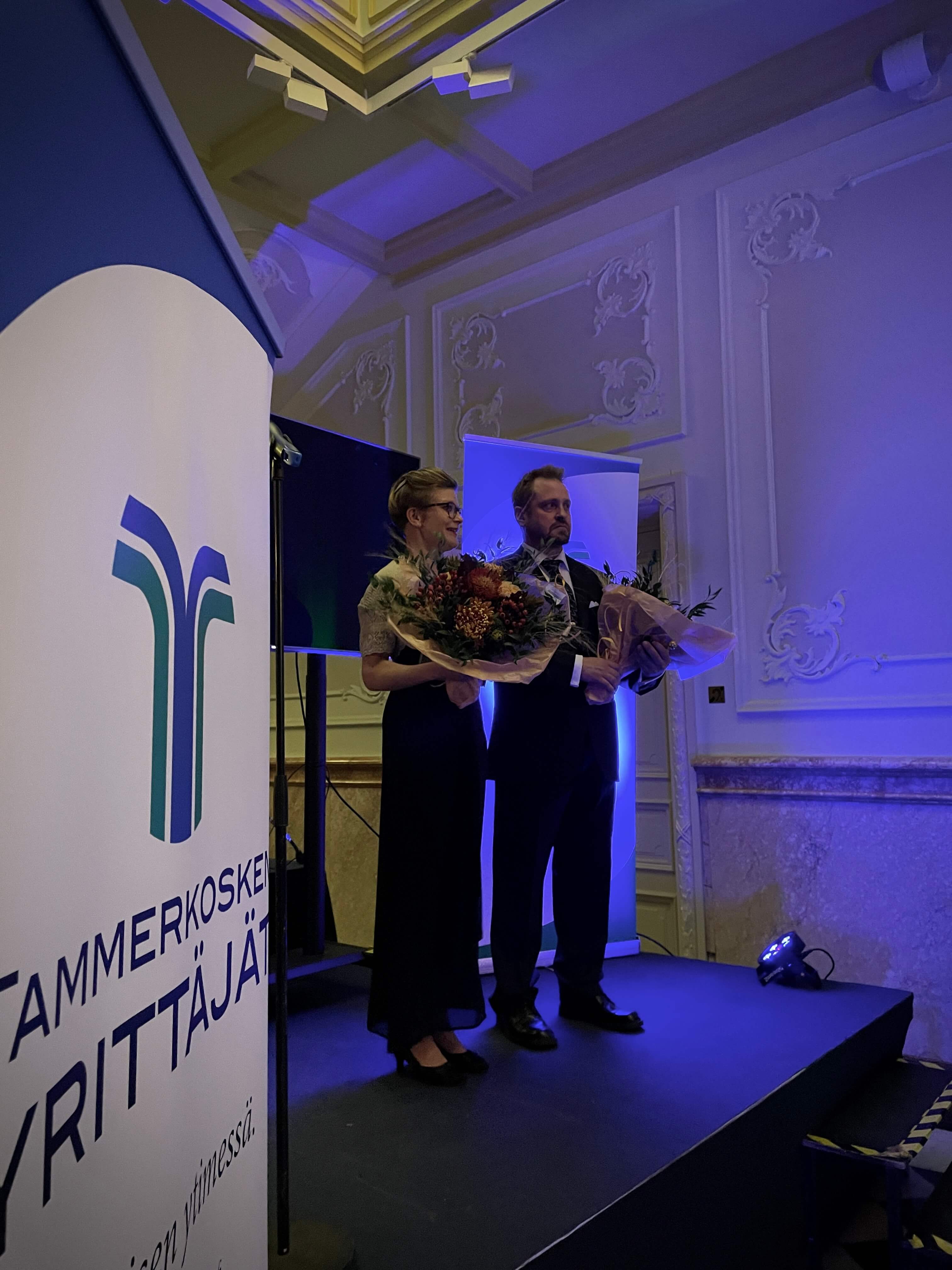 Illan kohokohtana paljastettiin odotetusti Tammerkosken Vuoden yrittäjä vuosimallia 2022. Ansaitun tittelin saivat Valaisinliike Tampereen Sähkö Oy:n Nora ja Marko Juusela, joiden valaisinliike Ojakadun legendaarisessa korttelissa on tuttu näky eri sukupolvien tamperelaisille. Jo 1940-luvulta asti toimineen liikkeen yrittäjinä he ovat olleet yli 12 vuoden ajan. Paikallisen kivijalkaliikkeen muistaminen Vuoden yrittäjä -palkinnolla oli selvästi koskettava ja ylpeä hetki, jota sivuttiin myös kiitospuheessa.
