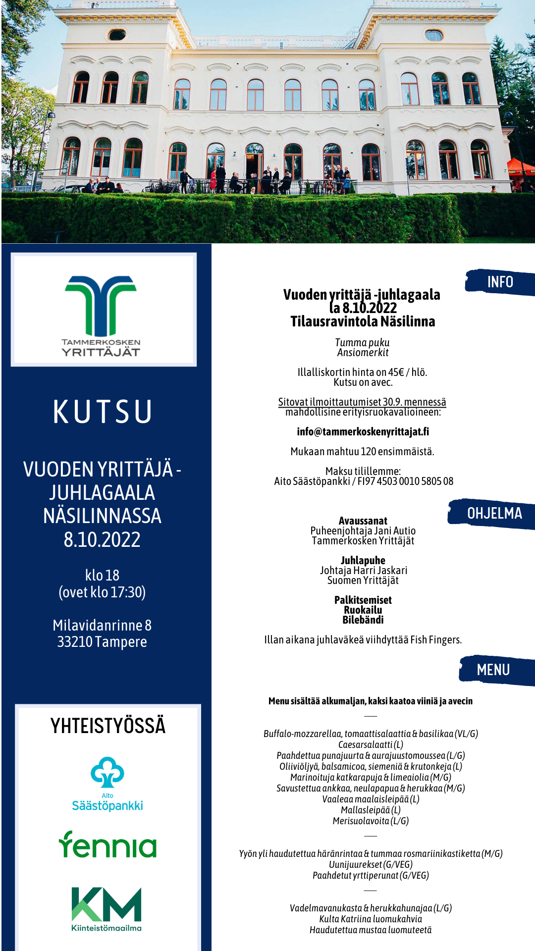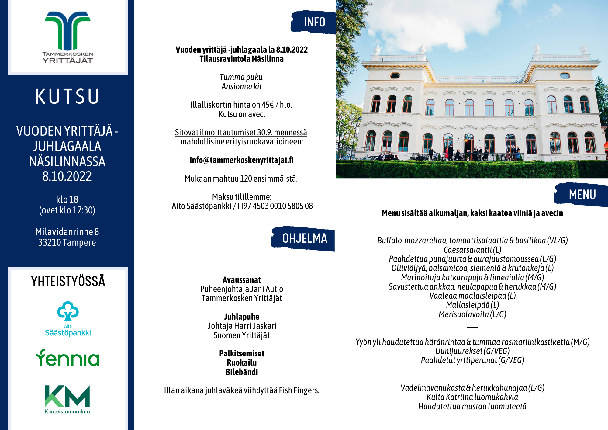 Ohjelmaan sisältyy niin palkitsemisia, ruokailua kuin vapaata seurusteluakin. Illan tunnelmaa kohottaa energinen bilebändi Fish Fingers, ja luvassa onkin taatusti syyskauden parhaat bileet Näsilinnan tunnelmallisessa miljöössä.